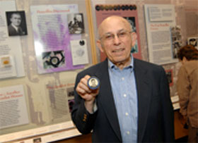 Ira Friedman proudly displays his first Pfizer photo ID at the Pfizer Heritage: Brooklyn and Beyond exhibit in New York.